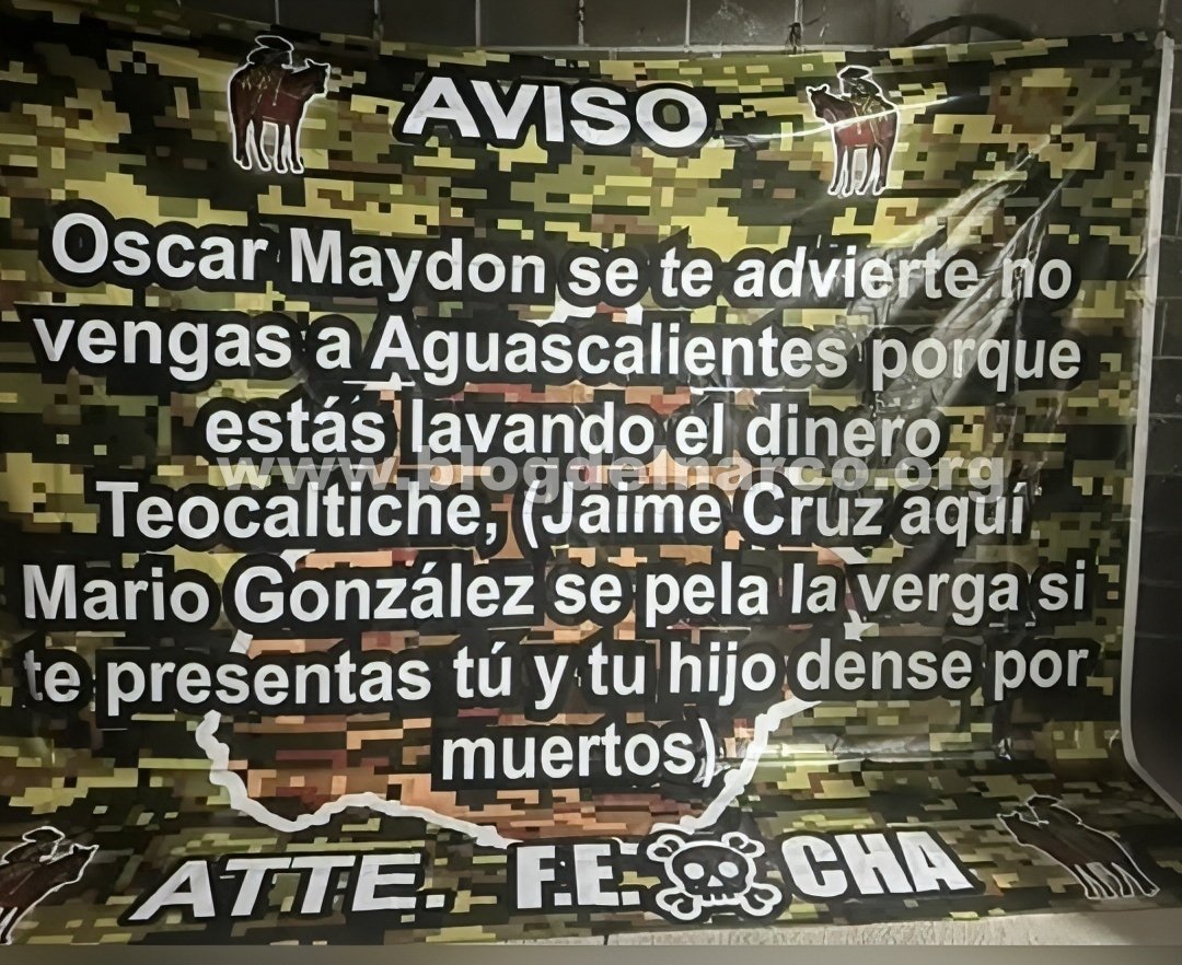 “Óscar Maydon, se te advierte, no vengas a Aguascalientes porque estás lavando dinero en Teocaltiche. (Jaime Cruz, aquí Mario se pela la ver*, si te presentas tú y tu hijo, dense por muertos). ATTE. F.E.CHA.”, se leía en una de ellas.
